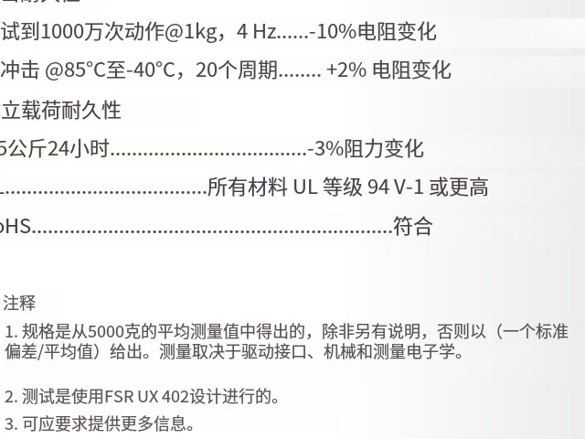 特点:改进的感测范围从0.5N扩展到150N,超薄外形因子,能够承受极端的温度和条件,经过1000万次操作测试,简单且易于集成,可根据各种应用进行定制,经济高效。